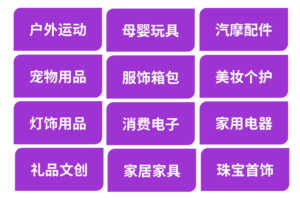 Pet supplies, daily-use items, Toys for babies and mothers     Clothing and luggage    Home furniture   Beauty and personal care products   Lighting fixtures, Gifts and cultural products , Consumer electronics   Outdoor equipment     Household appliances      Jewelry